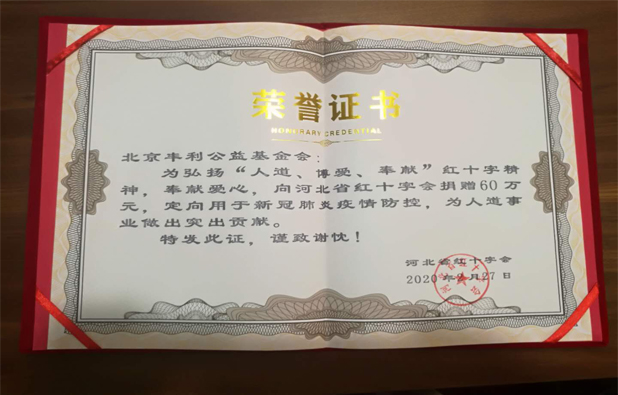 新冠肺炎疫情发生后,北京丰利公益基金会本着“具有高度的责任感,以向社会负责为己任”的企业精神,先后向河北省红十字会捐赠善款200万元和60万元人民币,定向用于支援防控新冠肺炎疫情。希望此次捐赠的善款全部用于新冠肺炎疫情防控工作和设立基金。河北红十字会特此颁发荣誉证书。